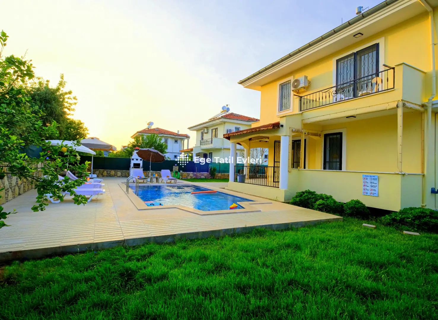 23) Villanın yüzme havuzundan veya duşundan gelen sudan meydana gelebilecek her türlü hastalıktan, klor alerjisinden vs. kimyasal alerjiden, EGE TATİL EVLERİ kesinlikle sorumlu tutulamaz. Sağlıksal veya vücut hassaslığı olan kişilerin havuza girmemesini tavsiye ederiz.