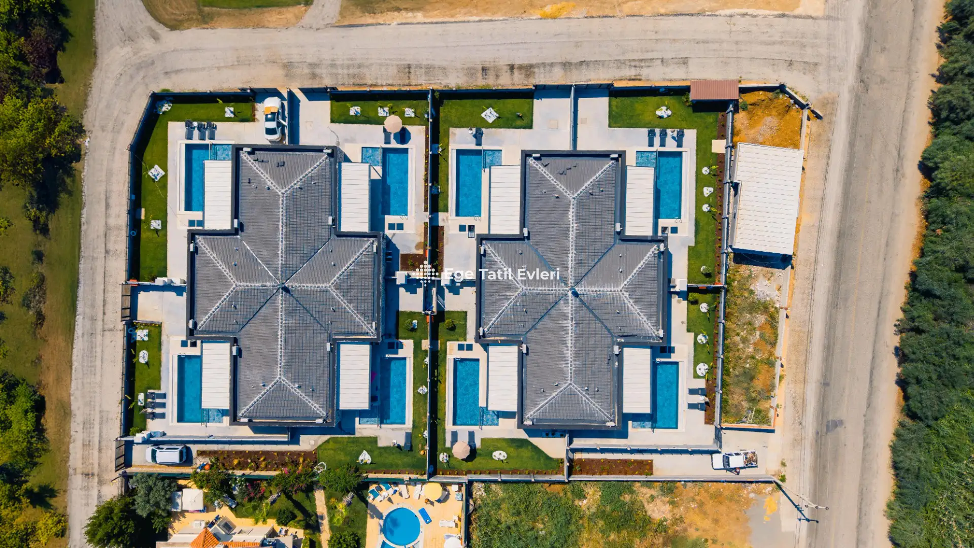 Not : 8 villadan oluşan karmaşıklığımız de tek çekimde kullanılmış olup iç parçalar tamamen aynıdır. Sadece havuz terası ve yeşil çim alanlarında farklılık bulunmaktadır. Bazı çim alanları küçük olanlardan bazıları geniştir.