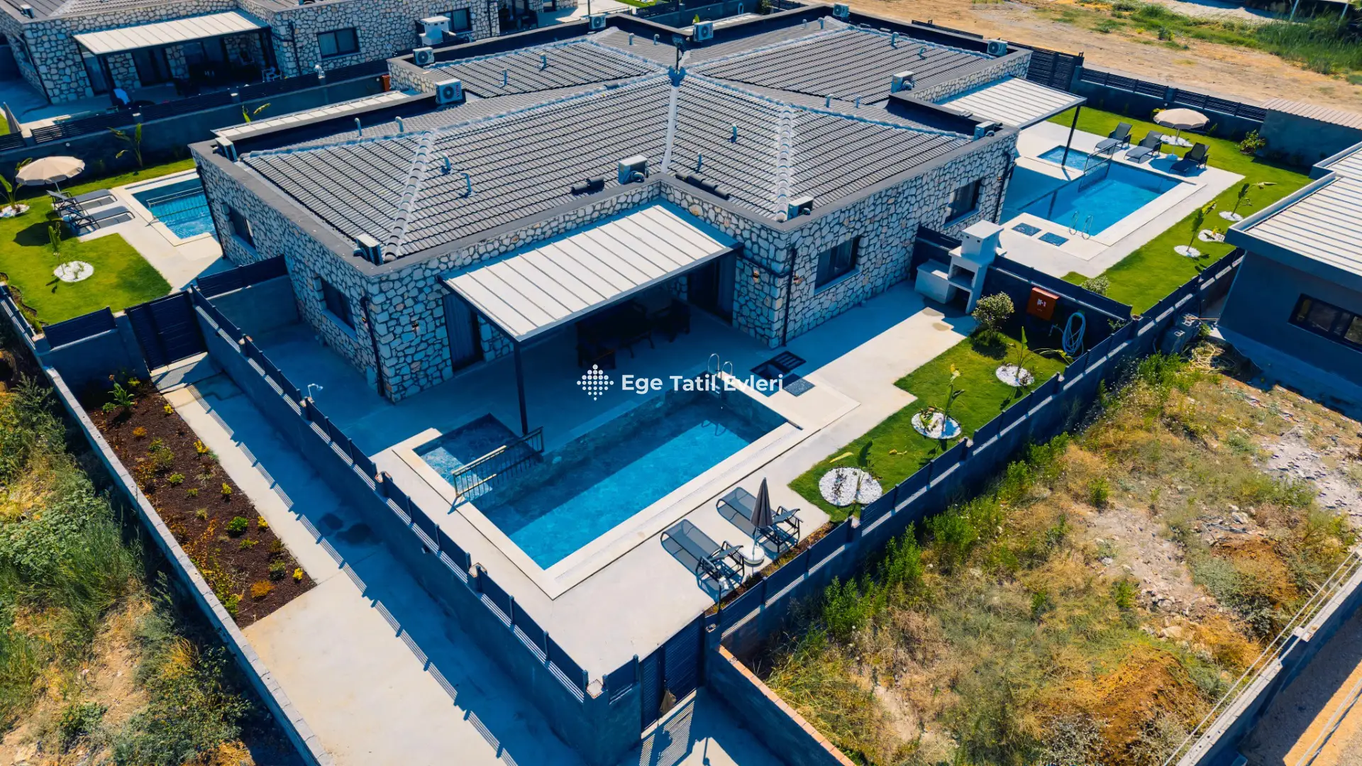 Not : 8 villadan oluşan karmaşıklığımız de tek çekimde kullanılmış olup iç parçaları tamamen aynıdır. Sadece havuz terası ve yeşil çim alanlarında farklılık bulunmaktadır. Bazı çim alanları küçük olanlardan bazıları ise geniştir.