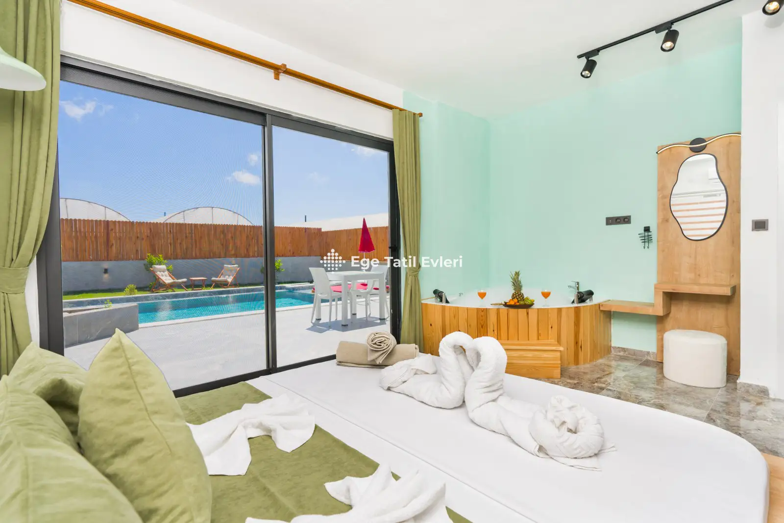 Web sayfasında belirtilen ve muhafazakar (havuzu dışarıdan görünmeyen villalar) olarak tanımlanan villalarda konaklama yapacak olan müşterilerimizin, yüzde yüz, görünmemezlik garantisini EGE TATİL EVLERİ vermez.
