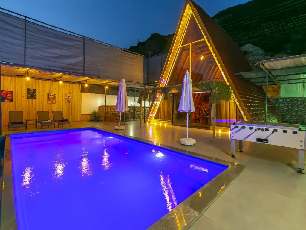 Bungalov 1014; Kalkan /Kördere bölgesinde bulunan villamız 1 yatak odası ve modern banyosu ile çiftler için romantik, küçük aileler için mükemmel bir seçenektir. Özel havuz ve jakuzisi ile unutulmaz bir konaklama deneyimi sunuyor. Villamızın korunaklı bahçesinde havuz, şezlong, oturma köşesi, salıncak, langırt, yemek masası ve barbekü yer almaktadır.