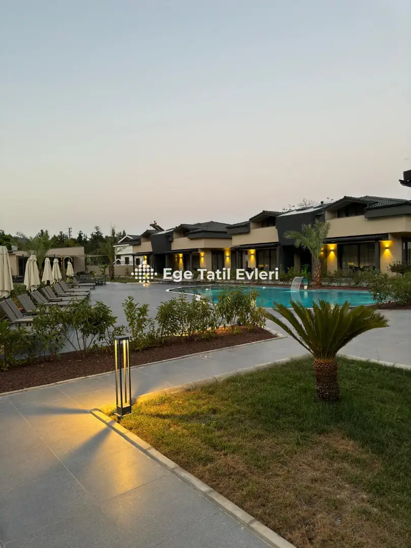 4 kişilik kapasiteye sahip villamızın bahçe alanında ortak havuz, şezlonglar ile masa ve sandalyeler bulunmaktadır.